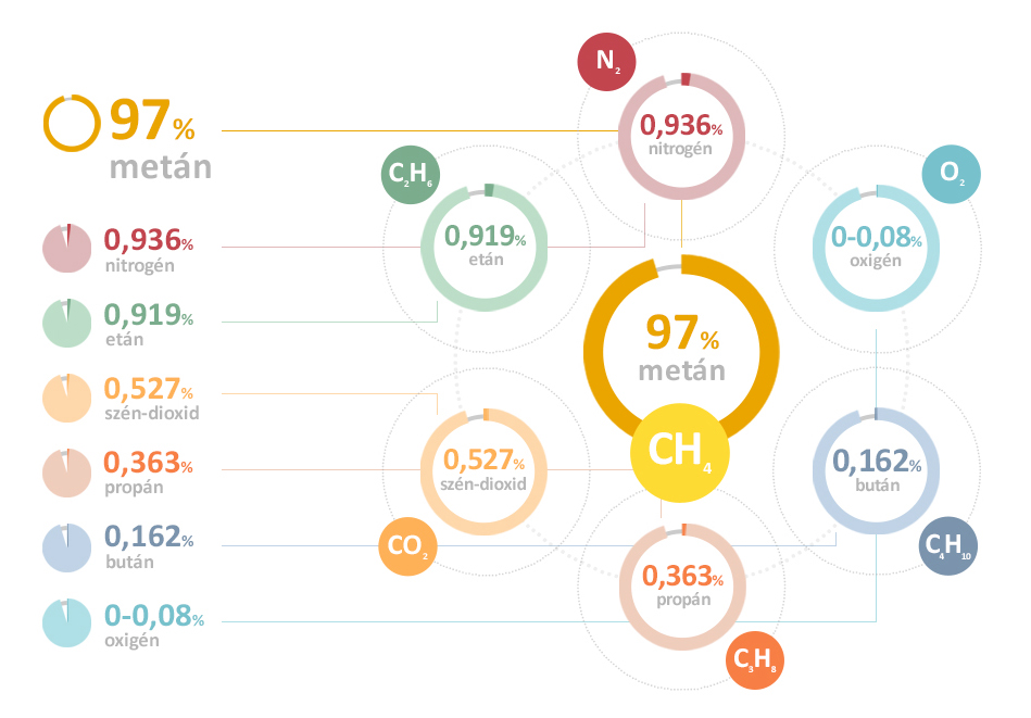 1 m3 földgáz teljes mértékű elégetéséhez megközelítőleg 10 m3 levegő szükséges. A földgáz tökéletes égése során kék lánggal ég, káros égéstermékek, füst, korom, hamu nélkül, igen alacsony szénmonoxid- és kéndioxid-kibocsátással, ezáltal környezetvédelmi szempontból a legtisztább energiahordozók egyike és nagymértékben hozzájárul az üvegházhatás mérsékléséhez.